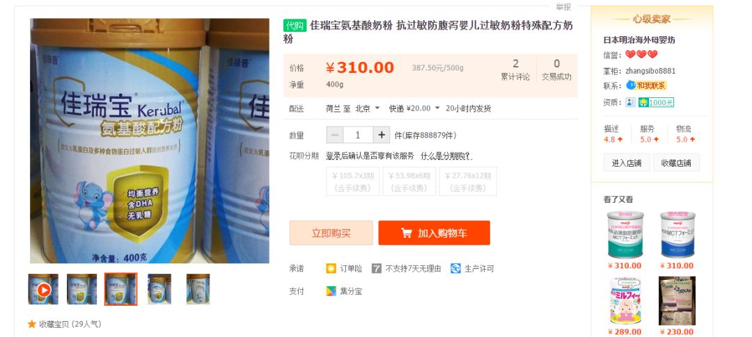 以淘寶上佳瑞寶氨基酸奶粉為例,該產品由被處罰的寧波特壹食品有限公司生產,截至發稿,淘寶仍在銷售。